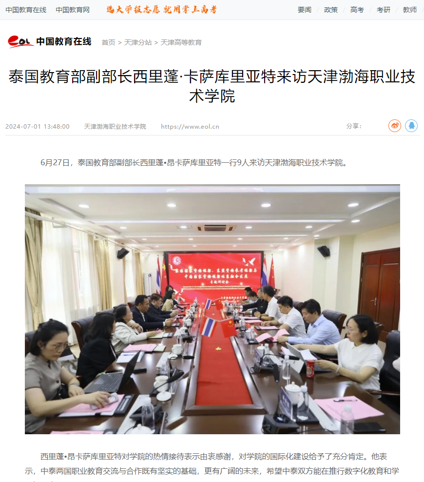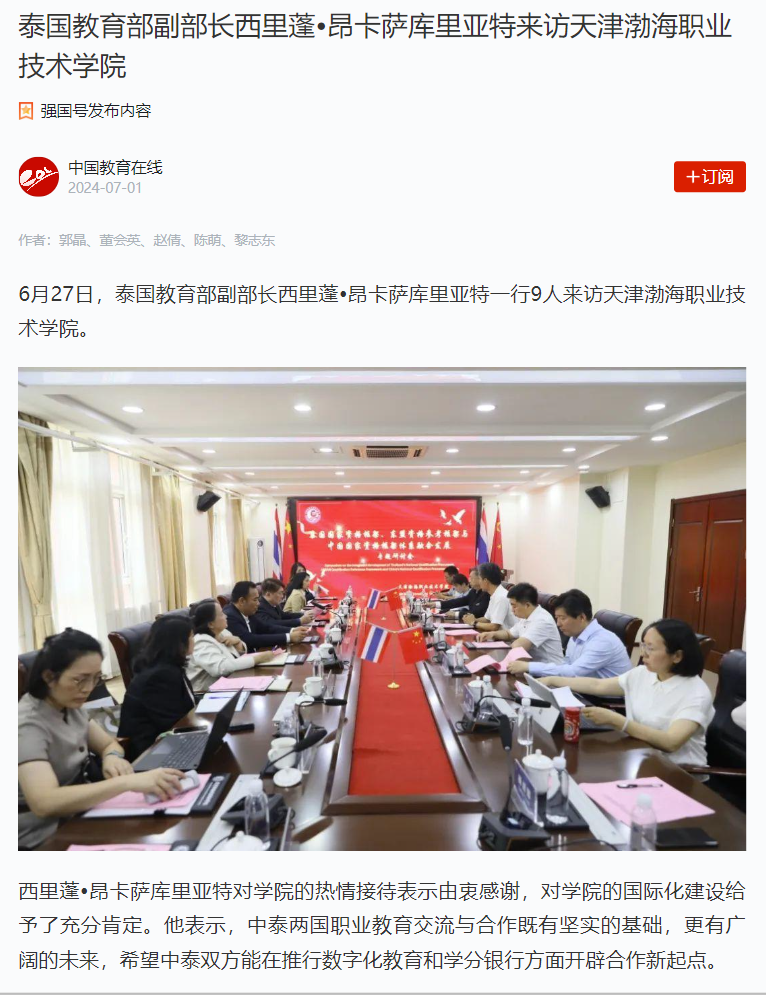 中国教育在线和学习强国报道泰国教育部副部长西里蓬·卡萨库里亚特来访学院。