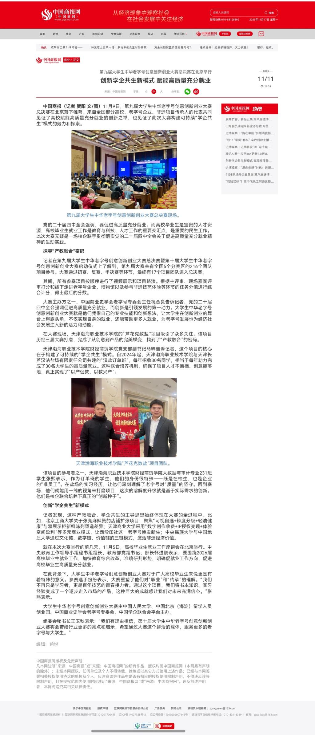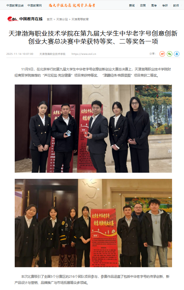 本月,在北京举行的第九届大学生中华老字号创意创新创业大赛总决赛上,学院财经商贸学院推荐的“芦花轻盐·克定健康”项目荣获特等奖、“津疆经纬·棉路星图”项目荣获二等奖。近日,这一佳绩相继获得学习强国、中国教育在线、中国商报网等媒体的聚焦报道。